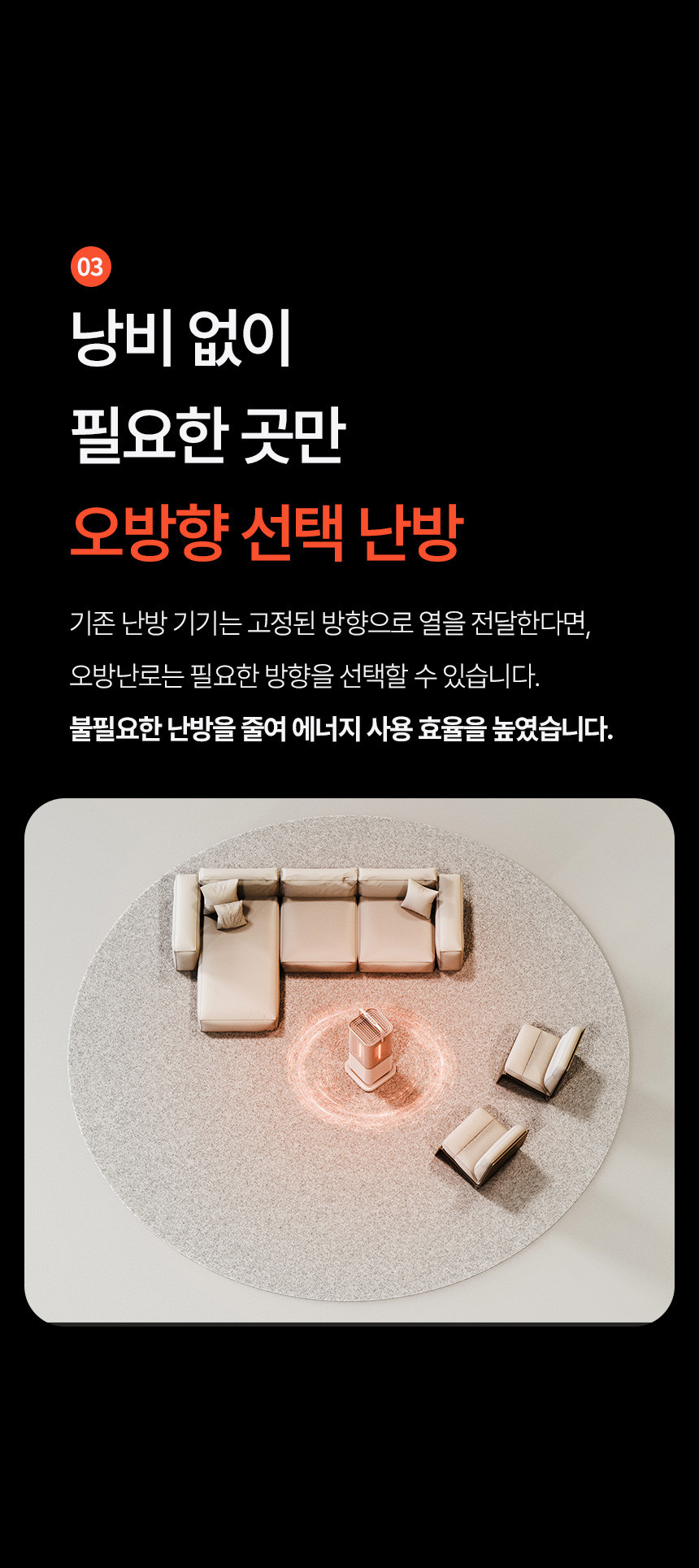 - 거실: 넓은 공간을 빠르게 데우고, 온 가족이 모이는 공간에 따뜻함을 선사합니다.
