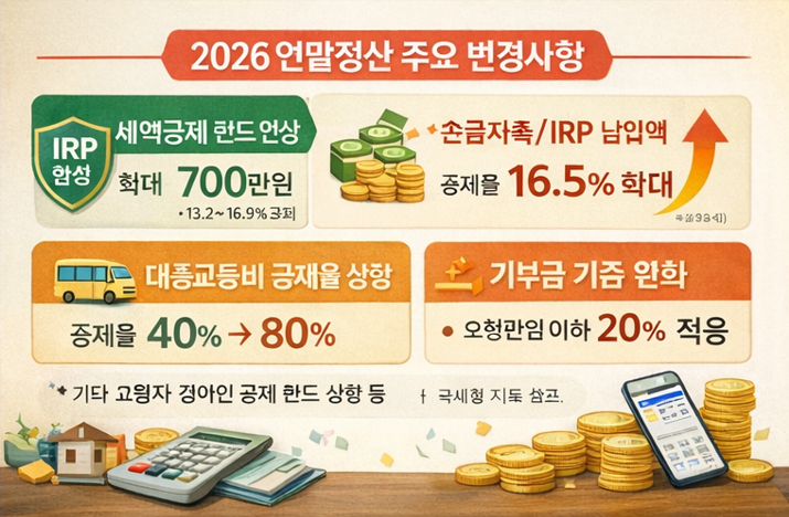 2026년 연말정산은 전반적으로 직장인에게 유리한 방향으로 개편되었습니다. 가장 큰 변화는 연금저축과 IRP 세액공제 한도가 통합되어 최대 700만 원까지 적용된다는 점입니다.